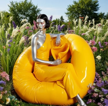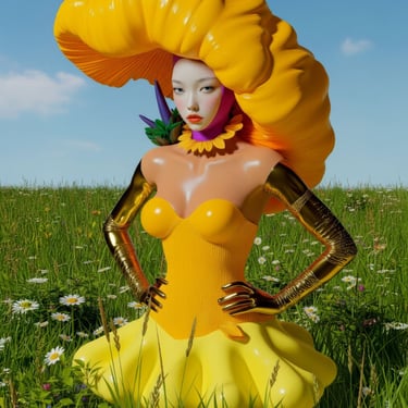 In this collection, Eliza builds a hyper-sensory garden where fashion and digital surrealism quietly collide. Lush florals and wild grasses frame sculptural figures whose metallic skin reflects light like polished chrome, blurring the line between human softness and synthetic perfection in RKTYX style.