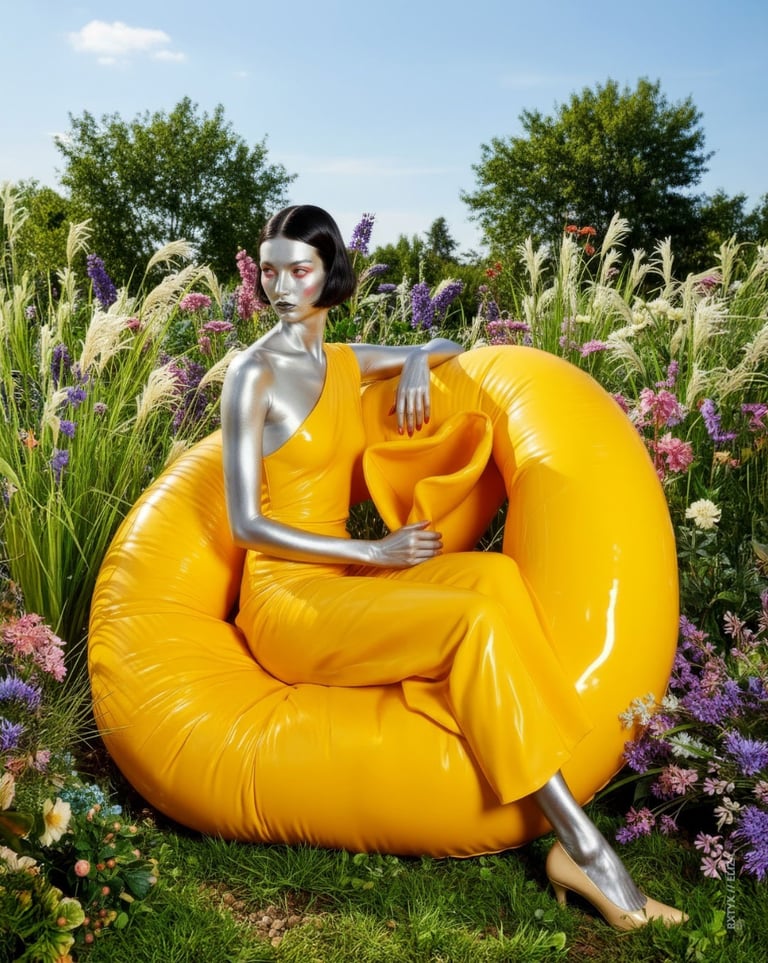 Vivid color takes the lead. Sunlit yellows, electric pinks, saturated greens, set against organic landscapes that feel both romantic and slightly unreal. Dresses cling and flow like liquid, glossy and sculpted, echoing inflatable forms and exaggerated silhouettes that transform the body into an object of design.