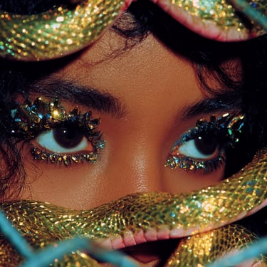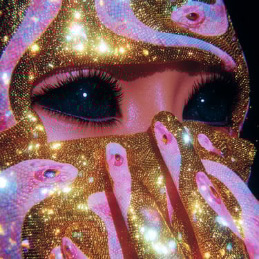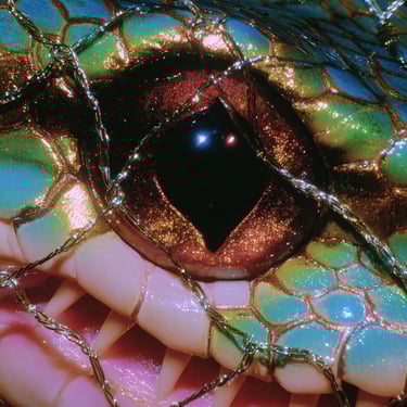 The serpents serve as multifaceted symbols: guardians of sacred knowledge, embodiments of temptation, and reminders of the biblical devil, the archetypal outsider who introduced original sin precisely because he existed beyond the boundaries of paradise. This duality infuses the work with a haunting tension, seductive yet toxic, luxurious yet claustrophobic, beautiful yet profoundly isolating.